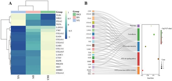 (A,B) The clustering heat map of key gene expression and the pathways involved in key genes.