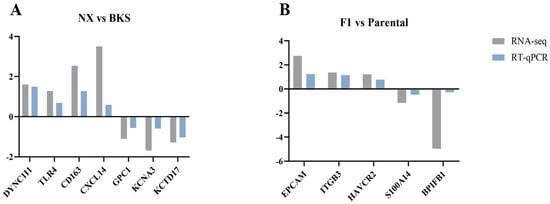 To verify the accuracy of the RNA-seq data, we screened seven differential genes (DYNC1I1, TLR4, CD163, CXCL14, GPC1, KCNA3, and KCTD17) based on immune-related terms and pathways between Ningxiang pigs and Berkshires for qRT-PCR analysis. In F1 offspring and parental groups, we screened five differential genes (EPCAM, ITGB3, HAVCR2, S100A14 and BPIFB1) for qRT-PCR analysis based on immune-related terms and pathways. Since the number of terms and pathways associated with each set we screened varied, the number of differential genes screened varied, resulting in a different number of genes in our validation. The findings revealed that the expression patterns of these genes by qRT-PCR were aligned with the RNA-seq data, confirming the reliability of the DEGs identified by RNA-seq in this study (Figure 7).