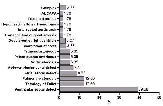 A total of 56 patients were included in the study, with a median age of 35 months old (Q1–Q3: 5.75–111 months) and an approximately equal distribution among the sexes, as 32 patients (57.14%) were females. A family history of CHD was present in a total of 15 patients (26.78%), and 1 subject was born from consanguineous parents. The most common CHD in our study population was the ventricular septal defect (22 subjects—39.28%), followed by the tetralogy of Fallot and pulmonary stenosis (both with 7 subjects—12.5% each). Two patients had associations of more than two other types of CHDs, termed complex CHD (Figure 1).
