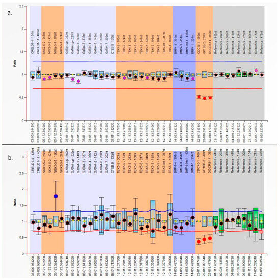 The MLPA analysis revealed the presence of CNVs in two of our subjects (3.57%), both from the syndromic group (Figure 2). Case no. 1 was a 5-year-old girl (at the time of blood sampling) with interrupted aortic arch type B and a perimembranous ventricular septal defect (VSD), surgically corrected at the age of 5 days, associated with craniofacial dysmorphism, characterized by small and low-set ears, low nasal bridge, up-slanted palpebral fissures, macroglossia, long philtrum, and mild developmental delay, especially regarding language acquisition. The MLPA analysis showed a heterozygous deletion of the CDC45, GP1BB, and DGCR8 genes, representing a DNA fragment of the minimum 630 kbp from the 22q11.2 region.