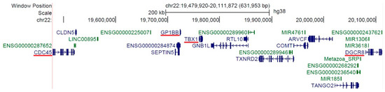 The genetic architecture of the deleted DNA fragment found in the 22q11.2 region from our patients; blue—coding genes, green—non-coding genes, and red line—genes of interest (generated using http://genome.ucsc.edu (accessed on 27 January 2024) [30]).