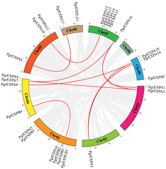 Figure 2. Collinearity analysis of expansin genes in pomegranate. Red lines indicate the collinearity of expansin genes among chromosomes in pomegranate; gray lines in the background indicate all the collinear blocks among different chromosomes.
