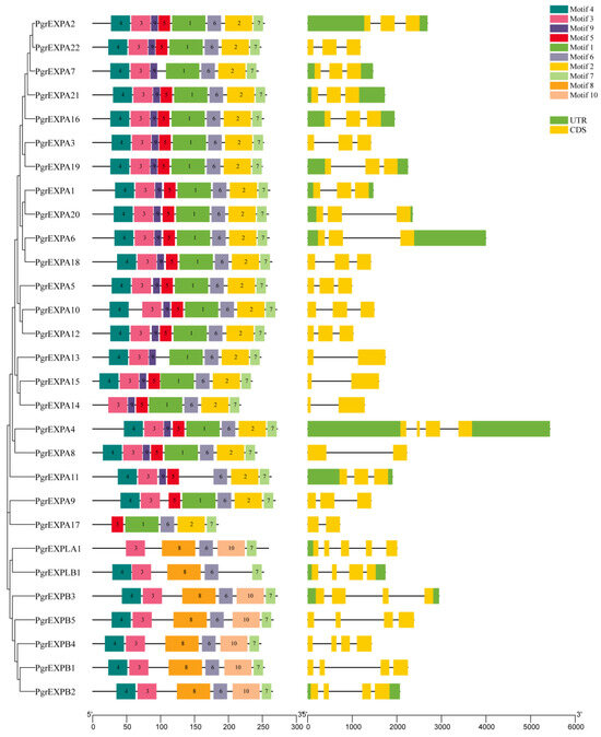 Figure 3. Protein domain architecture and gene structure of PgrEXPs. The Leaf figure shows the conserved motif composition of PgrEXP proteins. The motifs (numbered 1–10) are displayed in different colored boxes. The right figure shows the exon–intron structure of PgrEXPs. The green boxes indicate untranslated regions (UTR), yellow boxes indicate exons, and black lines indicate introns.