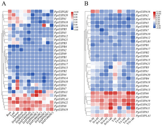 Figure 4. Expression profiles of the PgrEXPs in different tissues and varieties of pomegranate. (A): The transcript data of PgrEXPs in the root, flowers, and leaf as well as the peel, sarcotesta, and mesotesta at three development stages (50, 95, and 140 days after pollination) were processed with log2 normalization based on FPKM values. “OSC” = sarcotesta, “ISC” = mesotesta. (B): The transcript data of PgrEXPs in the mesotesta and sarcotesta of hard-seeded cultivar ‘Dabenzi’ and soft-seeded cultivar ‘Tunisia’ at three development stages (50, 95, and 140 days after pollination) were processed with log2 normalization based on FPKM values. “D” = ‘Dabenzi’; “T” = ‘Tunisia’, “O” = sarcotesta, and “I” = mesotesta. The subsequent number represents the days after pollination.