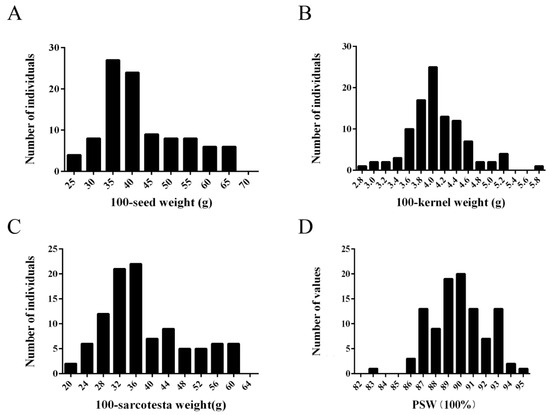 Figure 5. Distribution of seed weight-related parameters for mature fruits of pomegranate accessions. (A) 100-seed weight; (B) 100-Kernel weight; (C) 100-sarcotesta weight; (D) PSW.
