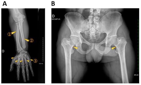 - Unger, S.; Ferreira, C.R.; Mortier, G.R.; Ali, H.; Bertola, D.R.; Calder, A.; Cohn, D.H.; Cormier-Daire, V.; Girisha, K.M.; Hall, C.; et al. Nosology of genetic skeletal disorders: 2023 revision. Am. J. Med. Genet. Part A 2023, 191, 1164–1209. [Google Scholar] [CrossRef] [PubMed]