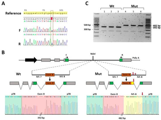 - Baralle, D.; Baralle, M. Splicing in action: Assessing disease causing sequence changes. J. Med. Genet. 2005, 42, 737–748. [Google Scholar] [CrossRef] [PubMed]