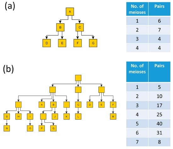 Two pedigrees and the corresponding number of pairwise meioses (e.g., 1 meiosis indicates a father–son pair, and 2 meioses indicates either a pair of brothers or a grandfather–grandson pair); the letters represent unique identifiers for individuals that have been genotyped: (a) a relatively small pedigree with all individuals included; and (b) a larger pedigree with some missing individuals (i.e., without genotype information), as shown by the lack of an identifier in the node.