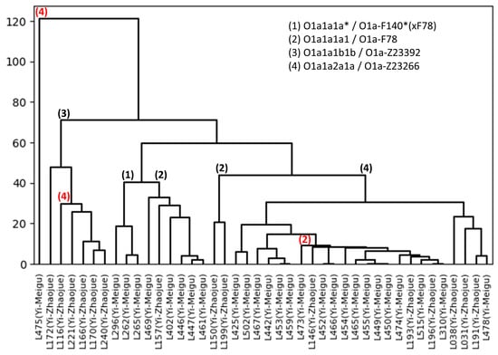 A dendrogram obtained with the MPT based on Y-filer Plus population data from Wang et al. 2021 [28] showing a subset of 42 males belonging to different subhaplogroups of the Y-SNP haplogroup O1a. Note the strong concordance between the Y-STR-based dendrogram and the phylogenetic Y-SNP subhaplogroup tree indicated by branch numbers. Red numbers indicate remarkable deviations between the Y-STR-based dendrogram and the Y-SNP phylogeny.