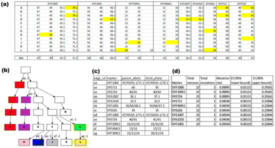 Mutation rate analysis performed by the MPT: (a) the genotypic input of the Y-STRs that were variable within this pedigree; mutations are highlighted in yellow; (b) the visible output where the MPT draws the pedigree and indicates mutations and uses coloring to show unique haplotypes within the pedigree; (c) the specifications of the mutations; and (d) the format of the output table used to estimate the mutation rate.