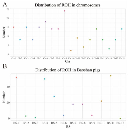 ROH number statistics of Baoshan pigs. (A) Distribution of ROH numbers on chromosomes; (B) distribution of ROH numbers on individual BS pigs.