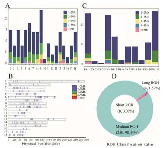 Statistics of ROH length and distribution in BS pigs. (A) Distribution of different lengths of ROH on chromosomes; (B) position of different lengths of ROH on chromosomes; (C) distribution of different lengths of ROH on individual BS pigs; and (D) number and proportion of long, medium, and short ROHs.