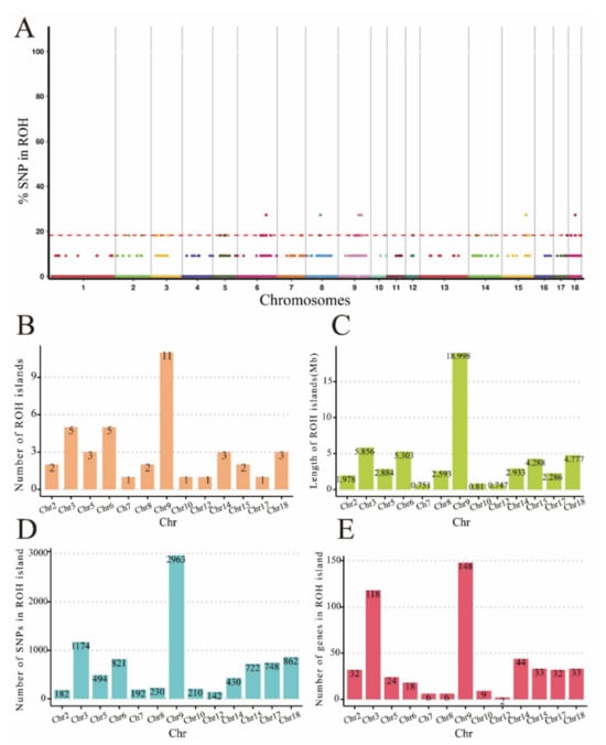 Identification and statistics of ROH islands in BS pigs. (A) Identification of ROH islands in BS pigs; the red dashed line in the figure indicates the threshold line and the colored dots overlapping with or above the threshold line indicate the detected ROH islands. (B–E) Statistics of the distribution of ROH islands on chromosomes in terms of the number of ROH islands in BS pigs, their lengths, the number of SNPs, and the number of genes.