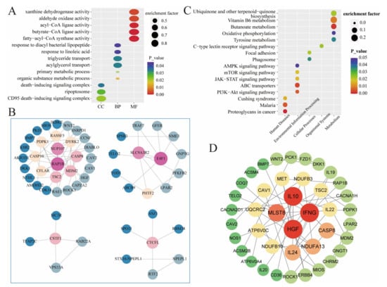 Genes were significantly enriched in 219 tertiary entries across all GO entries, including 3 cellular components, 60 biological processes, and 156 molecular functions (Table S3). The genes were mainly related to biological processes, such as organic matter metabolism, lipid substance metabolism, compound metabolism, and molecular functions, such as multiple enzyme activities (ligases, synthetases, and transporter enzymes), substance transport, and substance binding. Some of the significantly enriched entries are shown in Figure 4A. The genes in the significant entries formed a total of four interaction networks, of which 30 genes had interactions centered on NUP107 and RAP1B, 13 genes had interactions centered on SLC9A3R2 and E4F1, 5 genes had interactions centered on the CSTF1 gene, and 7 genes had interactions centered on the CTCFL gene (Figure 4B). The genes were significantly enriched in 16 secondary pathways across all KEGG pathways (Table S4). These included three pathways for Human Diseases, five pathways for Environmental Information Processing, two pathways for Cellular Processes, one pathway for Organismal Systems, and five pathways for metabolism (Figure 4C). The 41 genes in these pathways formed an interaction network centered on 4 genes: IL10, IFNG, HGF, and MLST8 (Figure 4D).