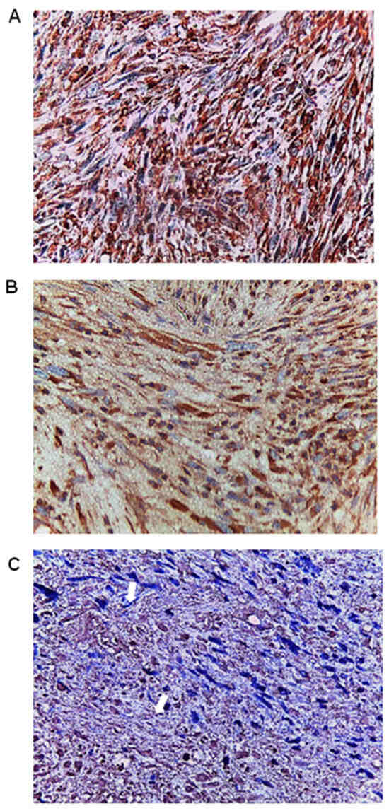 FGF23 (fibroblast growth factor 23) expression in UPSb tumour tissues (n = 10). (A) The immunostaining was mainly cytoplasmic throughout the UPSb tissues. (B) Intensity of the staining was higher in the spindle-shaped cells located in the cellular-dense lesions of UPSb. (C) Nuclear immunostaining in some UPSb pleomorphic cells (arrows) ((A–C) magnification: 40×).