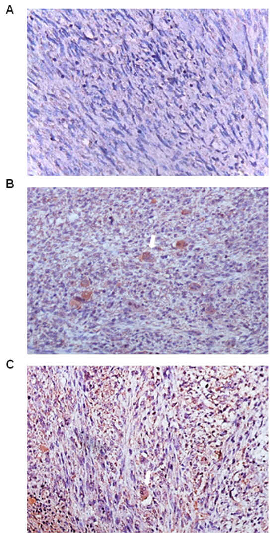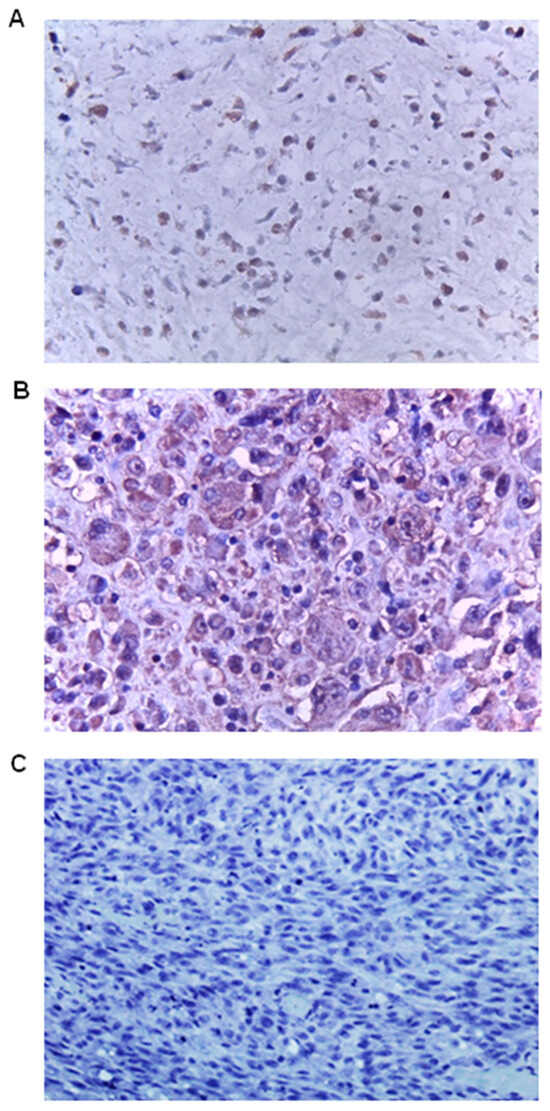 In UPSb tissues, the immunostaining was predominantly cytoplasmic, granular, and uniformly distributed throughout the tissues. The intensity of the staining was higher in the spindle-shaped cells located in the cellular-dense lesions (Figure 2A). However, strong nuclear immunostaining was also detectable in some pleomorphic cells (Figure 2B,C).