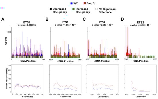 In previous publications, we demonstrated that Pol I NET-seq libraries contain mature rRNA contamination [,]. Therefore, an in-depth analysis of the spacer regions (ETS1, ITS1, ITS2, and ETS2) is critical to focus exclusively on the nascent RNA signal. To investigate Pol I occupancy in the spacers, the median occupancy and the moving average of the median occupancy (using a window size of 75 positions) were analyzed and plotted for each strain in the four spacer regions (Figure 2A–D), the same way as described in Figure 1A,B. For each region, we deployed the Kolmogorov–Smirnov (K-S) test, which probes for significant differences in the distribution patterns between strains (resultant p-values are included above each panel; Figure 2A–D). Overall, we observed that in both strains, there are peaks and valleys of Pol I occupancy, which are significantly different in relation to each other in all four spacer regions, confirming the altered pause profile in the hmo1Δ vs. WT strain (as observed in Figure 1). Furthermore, these occupancy pattern changes were exacerbated in the ITS1, ITS2, and ETS2 regions (the middle and the 3′ ends of the 35 S gene) in hmo1Δ vs. WT yeast. Altogether with Figure 1, these results suggest that Hmo1 is an important transcription elongation factor for Pol I and may promote efficient topology maintenance throughout the rDNA, which is consistent with the proposed function of this factor for Pol II [].