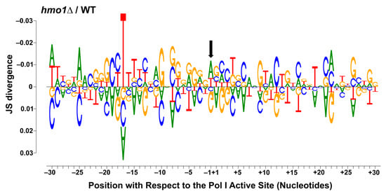 Based on the median occupancy histograms and spacer analysis (Figure 1 and Figure 2), we determined that the Pol I occupancy patterns were altered in the hmo1Δ strain compared to WT. Therefore, we next investigated whether this altered pause propensity in the mutant was sequence-dependent by generating a DiffLogo (Figure 3). For the DiffLogo, reads mapping to the spacer regions were isolated, and the top 2.5% occupied positions were identified (consistent with previous publications [,,,,]). In Figure 3, enriched sequences are included for hmo1Δ on top (JS divergence > 0), with WT underneath (JS divergence < 0). The last incorporated nucleotide (LNT) is indicated by the black arrow. These data demonstrate that in the hmo1Δ strain, Pol I is particularly sensitive to G-rich regions that are directly downstream of T-rich regions. Our findings suggest that Pol I pause sites are reorganized in the absence of HMO1 and indicate that Hmo1 promotes efficient transcription elongation in a sequence-specific manner.