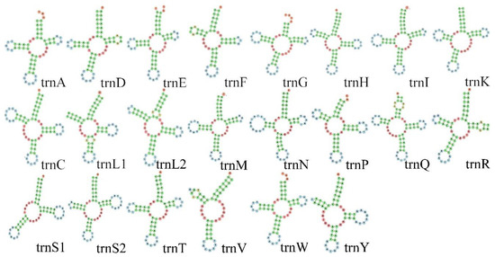 The length of the tRNA genes ranged from 54 to 69 bp, and most tRNA’s arms formed classic Watson–Crick pairs. Moreover, 23 U-G wobble pairs that have specific functions were found in the tRNA [53], which is common in invertebrates [54] (Figure 6). The rrnS gene was located between trnV and trnC, with a length of 757 bp and a C + G content of 28.79%. The rrnL gene (length: 1031 bp) was located between trnV and trnL, with a C + G content of 28.42%. The rRNA region of the new mitogenomes was 1788 bp in length, accounting for 11.86% of the whole mitogenome.
