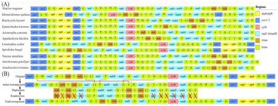 Comparison of mitogenome arrangements between different Diplopoda species. (A) Gene orders of the different types of mitogenome arrangement for the species used in this study. Gene segments are not drawn to scale. (B) The hypothetical process of the transposition of the gene block rrnS–rrnL–ND1 in the TDRL model. “X” indicates the partially random loss of the duplicated genes.