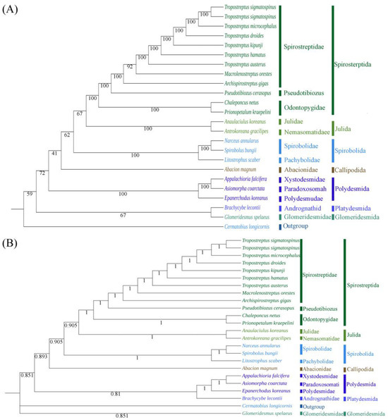 According to the current taxonomy, it is hypothesized that the orders Julida, Spirostreptida, and Spirobolida belong to the superorder Juliformia [62], but the specific relationships between these three orders remain controversial. A study based on mitogenomic analysis suggests that Julida and Spirostreptida have a sister-group relationship [63], while the morphological study suggested that Spirobolida and Julida have a sister-group relationship [60]. Studies based on mitochondrial genes, such as COX1 and rrnS, yield divergent perspectives [64,65]. The result obtained here were similar to those of previous phylogenetic studies based on the mitogenome. More mitogenomes will contribute to our understanding of the phylogenetic relationships between millipedes. Furthermore, our results showed a sister-group relationship between N. annularus and S. bungii, which did not agree with the result of Zuo Q. [28]. This might be due to the high levels of variation in the species selected for the two analyses.