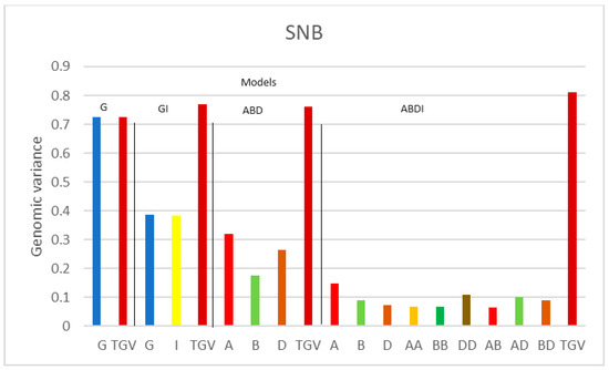 The tendency described for SNB of (i) sub-genome D having a more important role and (ii) statistical interactions being more relevant can also be observed for SB (Figure 3). Here, once again, the additive variance component of G drops from 0.608 to 0.339 when using model GI. Moreover, the sub-genome additive variance of sub-genome D is higher than for the other sub-genomes in model ABD, which is mainly captured by within-D interactions in the ABDI model.