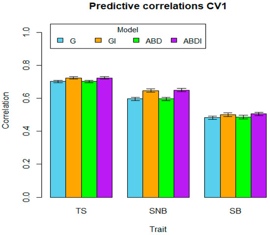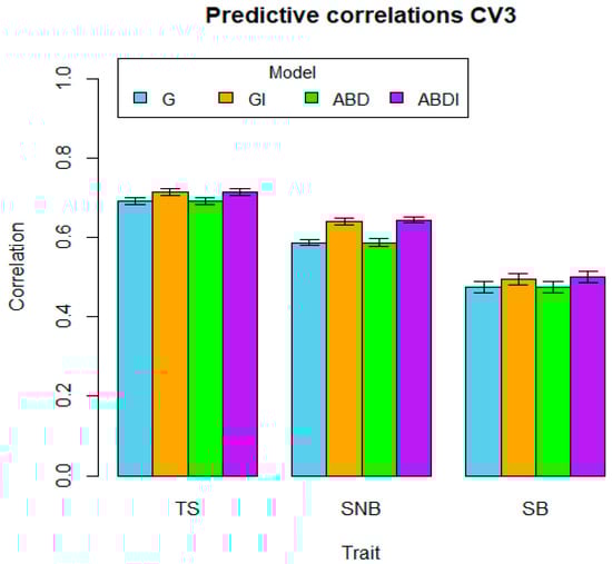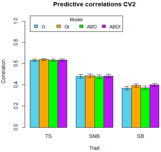 For the trait TS, we can observe that in the GI model, the interaction component I (Figure 1, Table 1) has a relatively small proportion of influence (0.163) compared to the additive component G (0.406). This may explain why the average predictions (Table 2) for the GI model (0.724) are not as high as those for the G model (0.702) for CV1. In the ABD model, the major variance components correspond to the A and B sub-genomes, with 0.196 and 0.244, respectively, while the D sub-genome only has 0.131. This behavior is different from the other traits in the ABD model. In the ABDI model, the additive components of the A and B sub-genomes show significant influence at similar magnitudes (0.105 and 0.187, respectively), while the epistatic components (AA, BB, DD, AB, AD, and BD) are similar and close to 0.05, reducing the residual component to 0.234. This may explain the increase in prediction for the ABDI model to 0.724 for CV1 (Figure 4). The intervals in the figures represent the standard error (SE) for each model and thus establish the significant differences between the genomic ability of the models. The bars represent the mean of the predictive correlations, and the whiskers denote distance intervals of one standard error from the mean, which aligns with the concept of a box plot where the bars signify the mean or median, and the whiskers represent a certain range or dispersion, typically one standard error.