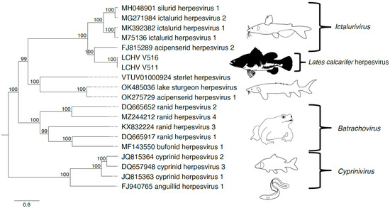 Alloherpesviridae phylogeny including Lates calcarifer herpesvirus (LCHV). The Alloherpesviridae phylogeny inferred using iqtree with the model LG + F + R5 on 12 core genes of 15 reference viruses, 2 references with 1 incomplete gene, and LCHV isolates V511 and V516. On the leaves, the GenBank accession no. and scientific name are displayed. On the right, the genera to which they belong has been indicated. The tree has been midpoint rooted. Bootstrap values are shown at the nodes. Illustrations were adapted from Walker et al. [22].