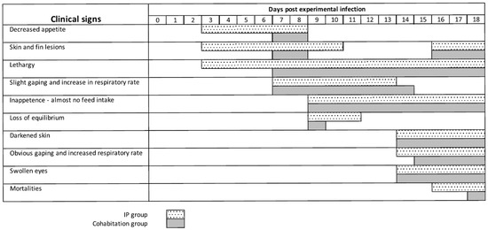In the first main infection experiment, where we used a 9.3 × 105 TCID50 dose per fish, 25 infected fish were cohabitated with 25 uninfected fish in the same tank, separated by netting. The clinical signs of both groups were monitored each day and summarized in Figure 3. The experimentally infected fish and the cohabitant fish showed grossly the same clinical signs of disease, which resembled the signs observed in the fish from which the virus was cultured. The first signs of disease, loss of appetite, skin and fin lesions, and lethargy appeared at Day 3 in the IP group, and at Day 7 in the cohabitant group. On Day 9, food intake had ceased, a loss of swimming equilibrium was observed, and gaping started with an increase in respiratory rate, in both groups (see Supplementary Video S1). Darkening of the skin became apparent on Day 14 and swelling of the eyes on Day 15 (see Supplementary Videos S2 and S3). Mortality was seen in the IP group on Day 16 (8%), Day 17 (69%, cumulative mortality), and Day 18 (77%, cumulative mortality) (see Supplementary Figure S4A). In the cohabitant fish, mortality started one day later, but reached the same cumulative mortality by Day 18 (77%). It was decided to terminate the experiment and bleed the remaining fish because most likely not enough fish would have survived for the collection of materials at Day 21.