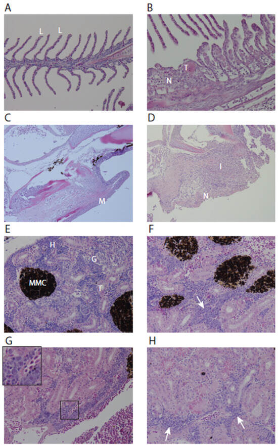 Gill and kidney histopathology of control and experimentally LCHV-infected fish. (A) Normal gill filament with details of lamellae “L”, 400× magnification; (B) Gill filament of LCHV experimentally infected fish at 17 dpi. Lamellae show shortening, blunting, adhesion, epithelial hypertrophy/hyperplasia, scattered necrosis “N”, and microthrombi “T”, 400× magnification. (C) Normal gill arch, “M” in the picture indicates mucosa, 200× magnification. (D) Gill arch of LCHV experimentally infected fish at 17 dpi. Detail of the mucosal necrosis “N” and inflammation “I”, magnification 200×. (E) Normal kidney, “H” = hematopoietic tissue, “MMC” = melanomacrophage center, “T” = tubules, “G” = glomeruli, 400× magnification. (F) Kidney LCHV experimentally infected fish at 14 dpi. Note that in the hematopoietic tissue, a larger proportion consists of large blastoid cells (arrow), 400× magnification. (G) Kidney at 14 dpi with suspect intranuclear inclusions in blastoid cells (inset), 400× magnification. (H) Kidney at 17 dpi. Intracytoplasmic, eosinophilic hyaline droplets in the tubular epithelium and presence of blastoid cells (arrows), 400× magnification. All panels: H&E stain.