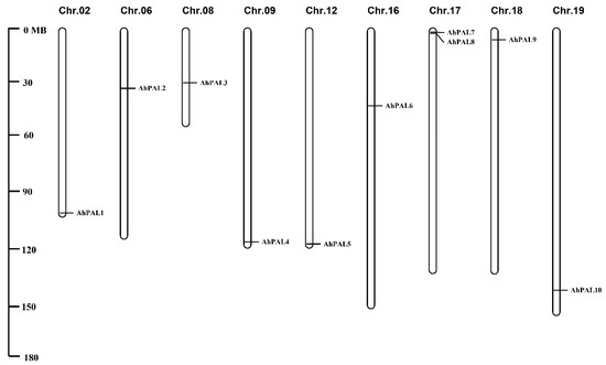 The ten AhPAL genes were mapped to nine chromosomes of A. hypogaea, corresponding to their physical positions as depicted in Figure 1. According to their order on the chromosomes, PAL genes were renamed as AhPAL1–AhPAL10 (Table 1). Only chromosome 17 contained two PAL genes (AhPAL7 and AhPAL8), whereas all other chromosomes contained one PAL member.