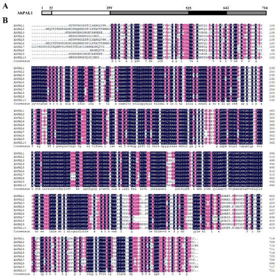 Detailed sequence alignment was performed for all deduced AhPAL proteins. As has been reported for PAL proteins in cucumber, melon, and watermelon [11,12,15], all AhPAL proteins contained four conserved domains (Figure 2 and Figure S1): the N-terminus (residues 1–22, numbered according to AhPAL1), MIO (residues 23–259), core (residues 260–525 and 643–714), and inserted shielding (residues 526–642). Importantly, the N-terminus of all AhPAL proteins showed the greatest divergence, consistent with PAL families in other plants [11,12,15,17,34]. Additionally, the conserved enzymatic active site, -200Ala-Ser-Gly (numbered according to AhPAL1), in the MIO domain and residues that were essential for PAL enzymatic activity (349Tyr and 492Gly) in the core domain were found in all AhPAL proteins [11,12,15,35]. Another significant residue is 547Thr, located within the shielding domain, identified as a potential phosphorylation site [12]. As depicted in Figure 2B, this site is conserved across only six AhPALs isoforms; in contrast, three out of the remaining four PAL proteins exhibit substitutions with Asn and Ser. This pattern suggests that the AhPAL family may exhibit enzymatic activity, albeit with varying degrees of substrate specificity.