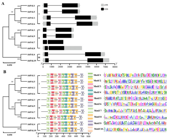 Exon–intron structure and conserved motif analysis of AhPAL genes. (A) The exon–intron structure of AhPAL genes. (B) The distribution of conserved motifs in AhPAL proteins.