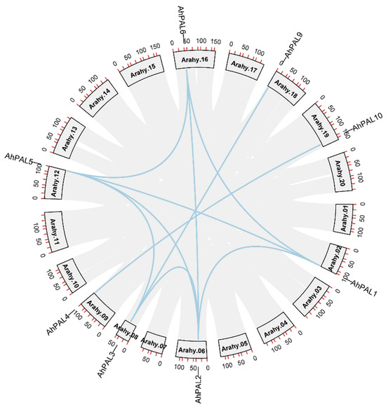 Circos figures for chromosome locations with AhPAL segmental duplication links. The blue lines indicate segmental duplicated gene pairs.