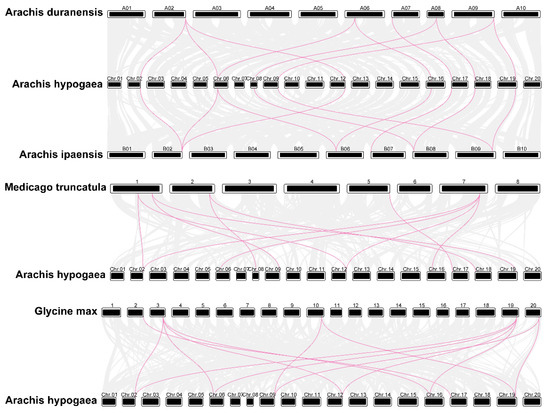 Furthermore, we investigated the synteny of PAL genes in A. hypogaea, A. duranensis, A. ipaensis, Medicago truncatula, and soybean genomes to characterize the evolutionary patterns of AhPAL genes within the Leguminosae species (Figure 6 and Figure S3). Ten and eleven gene pairs were identified between cultivated peanuts and wild-type A. duranensis and A. ipaensis, respectively (Tables S3 and S4). It appeared that most genomes of A. duranensis and A. ipaensis might have more than one ortholog in the cultivated peanuts (Figure S3). A. hypogaea contained twice the number of PAL members observed for A. duranensis and A. ipaensis, which is consistent with the fact that A. hypogaea, a tetraploid plant, is formed by chromosome doubling after the natural hybridization of two diploid wild species [23,24,41]. Similarly, 11 and 13 synteny gene pairs were detected between A. hypogaea and M. truncatula and the common bean, respectively (Tables S5 and S6). Additionally, nine AhPAL genes were orthologous in M. truncatula, the dicot plant, whereas seven AhPAL genes were found in the common bean, the monocot plant, suggesting that cultivated peanuts have close genetic relationships with other dicotyledonous plants.