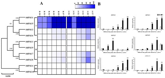Expression patterns of AhPAL genes in A. hypogaea cv. Tifrunner. (A) The expression patterns of AhPAL genes in peanut seeds under A. flavus stress. (B) Relative expression level of AhPAL genes at different time points after infection by A. flavus. Error bars were obtained from three biological replicates. Values are means ± standard errors (SEs) of three independent biological replicates (n = 3). Asterisks indicate a significant difference between R and S at each time point as determined by Student’s t-test (* p < 0.05; ** p < 0.01).
