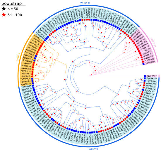 To analyze the evolutionary relationships of TgWRKY and AtWRKY, a phylogenetic analysis was conducted using IQ-TREE. The amino acid sequences of TgWRKY from T. grandis were aligned with those of AtWRKY from A. thaliana. The analysis revealed that the 78 predicted TgWRKY proteins could be classified into three primary groups: WRKY-I, WRKY-II, and WRKY-III. Specifically, Group I contained 6, Group II comprised 70, and Group III encompassed 2 TgWRKY proteins (Figure 1).