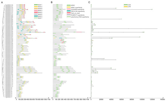The analysis of exon–intron structural diversity, a crucial aspect of gene family evolution, also supported phylogenetic classifications. This study’s intron and exon structure analysis aimed to enhance understanding of the phylogenetic relationships and classifications within the WRKY family. The findings indicated a variation in the number of introns (ranging from zero to eight) and exons (ranging from one to nine) across the gene family (Figure 2C).