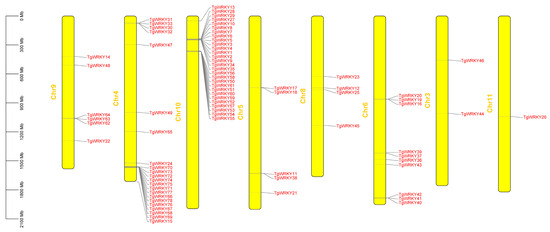 As depicted in Figure 3, the 78 identified TgWRKY genes were distributed across eight chromosomes of T. grandis. Notably, chromosomes 1, 2, and 7 lacked TgWRKY genes. Chromosomes 10 and 4 had the highest numbers of TgWRKY genes, with 28 and 22 genes, respectively. In contrast, chromosomes 11 and 3 had only one or two TgWRKY genes. The distribution of the remaining TgWRKY genes spanned the other four chromosomes, with chromosomes 6, 9, 5, and 8 hosting 10, 6, 5, and 4 TgWRKY genes, respectively.