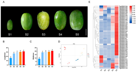 To elucidate the role of TgWRKY genes in the seed development of T. grandis, seeds were collected at five developmental stages, designated S1–S5, from May to September. A morphological analysis identified distinct patterns of development: a phase of rapid expansion from S1 to S2, followed by a relatively stable period from S3 to S5 (Figure 5A). Supporting these morphological findings, statistical analyses of seed length and width further illustrated the developmental progression of T. grandis seeds (Figure 5B,C). These stages formed the basis for the subsequent RNA-seq analysis.