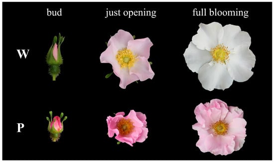 Flowers at three different floral development stages of R. praelucens with white and pink petals (Figure 1) were used for RNA-seq. All the sampled plants were naturally distributed in Xiaozhongdian town of Shangrila county in southwestern Yunnan Province, China. The environment and climate of their habitats were almost identical. The flowers at the same development stage removed of sepals and the bottom three-quarters of the hypanthium from one plant were mixed as one sample and immediately frozen in liquid nitrogen. Three plants with the same petal color at almost the same age and growth status were sampled for each replicate, and then a total of 18 samples were gathered and preserved at −80 °C within a refrigerator until further experiments were conducted.