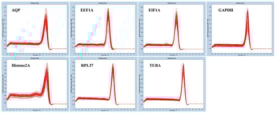 The seven candidate reference genes were amplified through qRT-PCR experiments, aiming to confirm the specificity of their primers. Their melting curves all showed a distinctive single peak without a primer dimer (Figure 2). All amplicons revealed good repeatability, indicating that the primers had strong specificity, reliability, and accuracy. As a result, all of the specific primers were shown to be appropriate for performing further qRT-PCR detection.