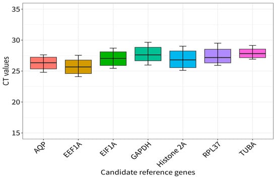 A Ct boxplot analysis (Figure 3) indicated that the Ct values of the seven candidate reference genes were within the range 25.69 ± 1.22 (EEF1A, n = 18) to 27.89 ± 0.79 (TUBA, n = 18), and that the average Ct values of EIF1A, GAPDH, Histone2A, RPL37, and AQP were 27.42 ± 1.24, 27.76 ± 1.27, 26.90 ± 1.46, 27.42 ± 1.24, and 26.28 ± 1.04, respectively. Among them, TUBA showed the least expression variation, from 26.92 to 29.14, with a coefficient value (CV) of 2.83%, followed by AQP from 24.80 to 27.62, with a CV of 3.96% (Table S2). The CVs of the others were 4.58% (GAPDH), 5.43% (Histone2A), 4.76% (EEF1A), 4.51% (RPL37), and 4.49% (EIF1A).