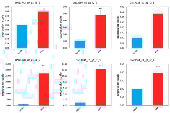 The qRT-PCR expression patterns of the petal-color-related candidate genes in the white- and pink-petaled individuals. Note: *** in the figures indicates statistical differences at p < 0.001. The p-values of DN11742_c0_g1_i1_6, DN12207_c0_g1_i2_9, DN17128_c0_g1_i2_5, DN14168_c0_g1_i1_6, DN11691_c0_g1_i1_3, and DN20564_c1_g1_i2_6 were 0.000018, 0.000000, 0.000000, 0.000000, 0.000000, and 0.000000, respectively.