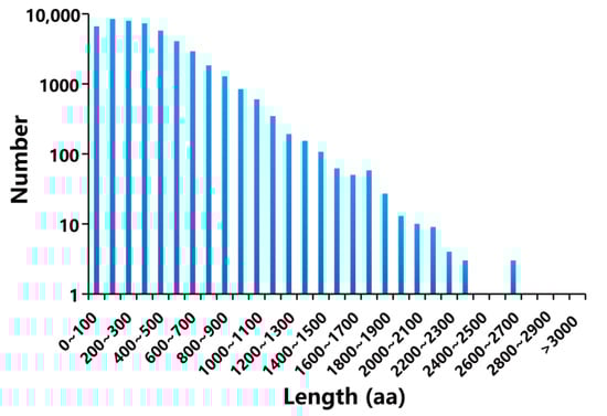 A total of 65,045 complete ORFs were obtained using TransDecoder. As illustrated in Figure 1, only a minority (29 CDSs) had more than 2100 base pairs (bp), and 86.68% of the CDSs appeared with a length ranging from 100 to 2100 bp. Then, all non-redundant unigenes were blasted against eight biological databases. The results showed that 59,958 unigenes were functionally annotated (Figure 2). Among them, 25,569 (39.41%), 27,306 (41.98%), 39,064 (60.06%), 42,504 (65.35%), 43,396 (66.72%), 49,022 (75.37%), 57,793 (88.85%), and 59,703 (91.79%) unigenes were annotated in COG, KEGG, KOG, GO, Swissprot, Pfam, eggNOG, and Nr, respectively (Table S2).