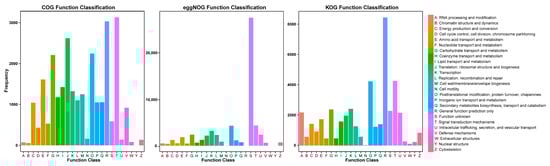Furthermore, 25,569, 39,064, and 57,793 unigenes were assigned using the COG, KOG, and eggNOG databases, respectively, and classified into 25 functional clusters (Figure 4; Table S3). In the COG functional annotation, “signal transduction mechanisms” (3132 unigenes) was the most common annotation followed by “general function prediction” (3032 unigenes) and “translation, ribosomal structure and biogenesis” (2620 unigenes). In the KOG functional annotation, the most common annotation was “general function prediction” (8455 unigenes) followed by “signal transduction mechanisms” (4268 unigenes) and “posttranslational modification, protein turnover, chaperones” (4235 unigenes). Although the eggNOG annotation had the most annotation numbers, the most common annotation was “function unknown” (27,338 unigenes).