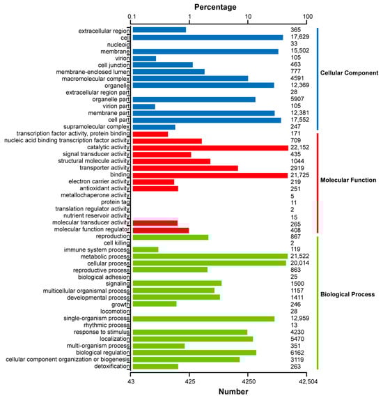For the GO analysis, 42,504 unigenes were annotated into three categories—molecular function, cellular component, and biological process (Figure 5; Table S5). Most transcripts clustered into the “catalytic activity” (22,152 unigenes), “binding” (21,725 unigenes), “metabolic process” (21,522 unigenes), and “cellular process” (20,014 unigenes) categories. In addition, the KEGG annotation is also illustrated in Table S4.