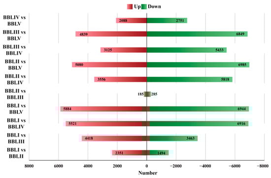 Overall, 30,556 transcripts were simultaneously expressed in the leaves of five different stages (Figure 6). Meanwhile, 4529 DETs exhibited stage-specific expression, with 1230, 215, 681, 980, and 1423 transcripts specifically expressed in BBLI, BBLII, BBLIII, BBLIV, and BBLV, respectively. To identify the key genes involved in terpenoid biosynthesis in B. balsamifera, we identified 25,200 DETs in 10 combinations (BBLI vs. BBLII, BBLI vs. BBLIII, BBLI vs. BBLIV, BBLI vs. BBLV, BBLII vs. BBLIII, BBLII vs. BBLIV, BBLII vs. BBLV, BBLIII vs. BBLIV, BBLIII vs. BBLV, and BBLIV vs. BBLV) based on NGS sequencing data. Among all of the DETs, the highest number of transcripts (12,828)—comprising 5884 up-regulated genes and 6944 down-regulated genes—were differentially expressed between BBLI and BBLV. This suggested a large biological difference between BBLI and BBLV. However, only a few of the transcripts (470) were differentially expressed between BBLII and BBLIII (Figure 7).