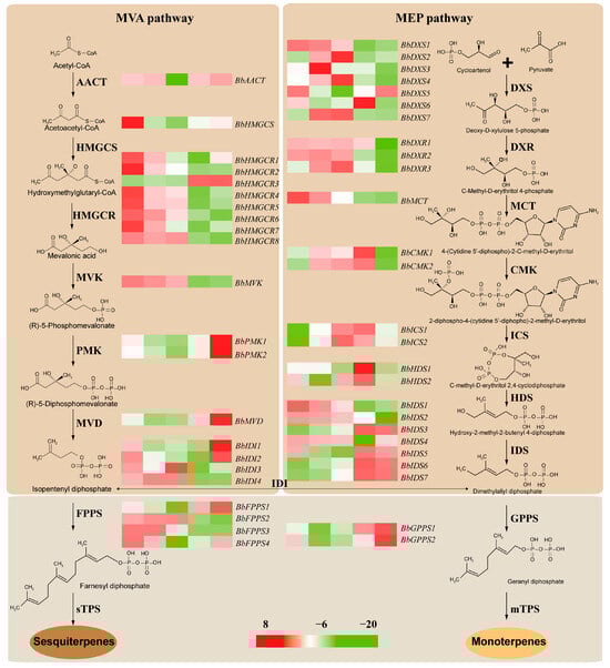 After removing genes with extremely low expression (FPKM < 1), a total of 116 genes were considered as DETs involved in terpenoid biosynthesis and require extensive investigation in the future. In the MVA pathway, there were 14 genes were identified as DETs related to IPP biosynthesis, including one BbAACT, 1 BbHMGCS, 8 BbHMGCRs, 1 BbMVK, 2 BbPMKs, and 1 BbMVD. As the first key gene involved in the MVA pathway, BbAACT showed a higher expression level at four developmental stages except for BBLIII, and BbHMGCS showed the highest expression in BBLI and the lowest expression in BBLIII. Almost all BbHMGCRs and one BbMVK had similar expression trends, with the highest expression in BBLI and the lowest expression in BBLIV. However, BbHMGCR3 had a different expression trend, with the highest expression in BBLV, which was similar to two BbPMKs and one BbMVK (Figure 8, Table S6). In the MEP pathway, a total of 24 DETs related to DMAPP biosynthesis were identified, comprising 7 BbDXSs, 3 BbDXRs, 1 BbMCT, 2 BbCMKs, 2 BbICSs, 2 BbHDSs, and 7 BbIDSs. There was no significant expression trend in the seven BbDXSs, but most showed the lowest expression level in BBLIV or BBLV. Three BbDXRs had relatively higher expression levels at four developmental stages except for BBLV. BbMCT showed a significant downward trend from BBLI to BBLV; however, two BbCMKs had an increasing trend from BBLI to BBLIV, with the lowest expression in BBLV. In contrast, two BbICSs showed the lowest expression in BBLI and the highest expression in BBLIII or BBLIV. The seven BbIDSs, BbIDS3, BbIDS5, BbIDS6, and BbIDS7 displayed the highest expression in BBLIV and BBLV, whereas BbIDS1, BbIDS2 and BbIDS4 displayed the lowest expression in BBLIV or BBLV. Meanwhile, four BbIDIs, four BbFPPSs, and two GPPSs were also identified and their expression is illustrated in Figure 8 and Table S6.