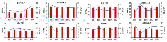Eight DETs were randomly selected to verify the gene expression levels using a real-time qPCR (RT-qPCR) test. The results showed that the relative expression levels of BbPMK2, BbFPPS1, and BbsTPS2 were higher in BBLI, and the relative expression levels of BbDXR3, BbCMK2, BbIDS1, and BbsTPS1 were higher in BBLII. Meanwhile, BbACCT showed greater expression in BBLV than in other stages (Figure 10). The RT-qPCR data were in good agreement with the FPKM value in the transcriptome, which proves the accuracy of the transcriptome data.